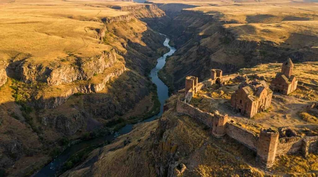 The Church of St. Gregory of the Abughamrents, the Seljuk caravanserai, the Zoroastrian temple ruins, the bridges over the gorge — the site requires three hours to cover in a way that does justice to what is here. The gorge is the southern boundary, the river sixty meters below, the Armenian hillside visible across it. It is worth sitting at the gorge edge for a while. The landscape across is not visually distinct from the landscape you are standing on. The difference is entirely political, entirely human, and entirely real.