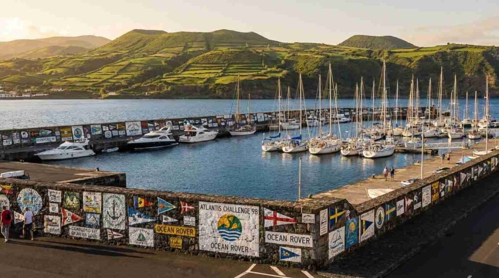 Horta, the island’s main town, is organized around the marina, which has been a waypoint for transatlantic sailors since the first wooden-hulled vessels crossed. The tradition of painting your boat’s insignia on the harbor walls goes back decades — the walls are now an archive of crossings, fading layers of paint that represent, if you follow them long enough, something close to a history of human willingness to be alone on the water. Peter’s Café Sport, open since 1918, is where they all eventually end up for a gin and to look at the same view their predecessors looked at. It is one of those rare places that has earned its own mythology without trying to.