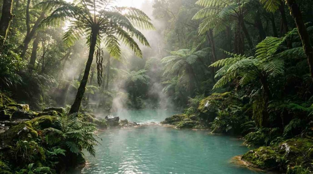 The thermal pools at Caldeira Velha, set in fern-lined forest above Furnas, are the ones worth getting to before ten in the morning. The water enters at 38 degrees, the air temperature hovers just above cool, and the combination produces something that is not quite swimming and not quite bathing but something older than either. Around you, tree ferns — a species that has been on this island for millions of years — form a green vault. You stay longer than you intended.