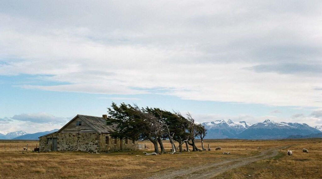Patagonian weather is not background. It is the subject. The wind that crosses the southern cone from the Pacific, having gathered speed across the Drake Passage and the open South Atlantic with nothing to interrupt it, arrives in the channels and the steppe with a consistent authority that the region’s entire built environment has been designed around. The estancia houses face away from the prevailing wind. The trees, where trees can grow, have been bent permanently in the direction of the prevailing wind, their branches stripped and their trunks inclined. The sheep move away from it instinctively.