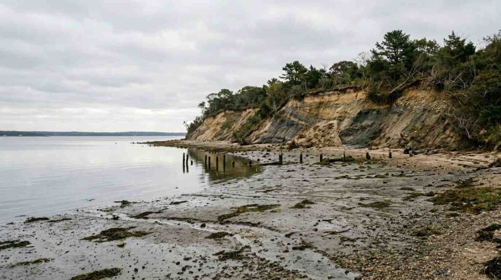 Erosion along Long Island’s north shore bluffs is not a new phenomenon, but it is an accelerating one. New York State’s SHPO database — the site inventory maintained by the State Historic Preservation Office — has flagged multiple locations along Cold Spring Harbor’s shoreline as areas where active erosion is exposing pre-contact and early colonial-era archaeological deposits. What that means in practical terms: every significant storm, every season of freeze-thaw, every high tide that bites a little further into the bluff face is also, inadvertently, excavating it.