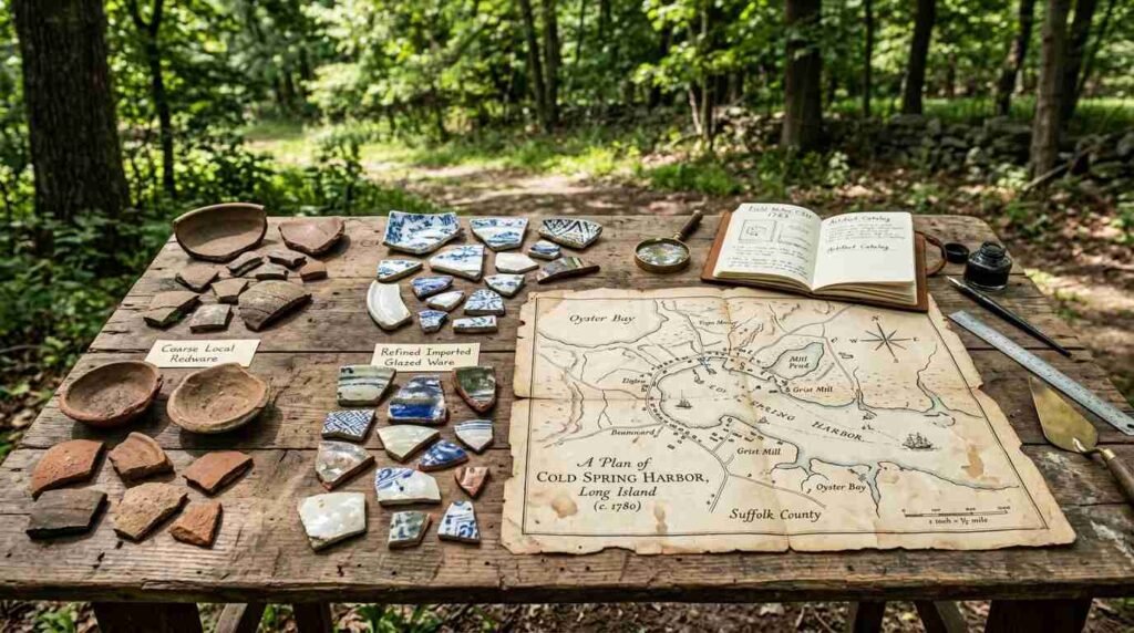 The sherds turning up along Cold Spring Harbor’s eroding bluffs — documented in Huntington Town landmark records and flagged through SHPO consultation — include both. Local coarsewares associated with small-scale production. Imported wares associated with a household economy that was participating in the broader Long Island Sound trading network. Together, they sketch the outline of a working community that left no other written trace.