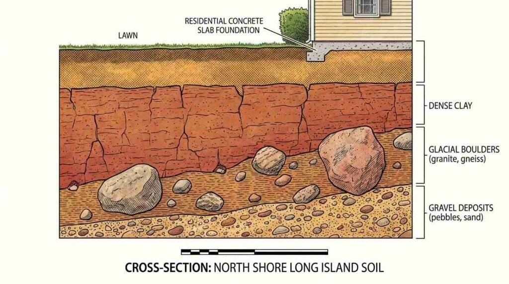 The Wisconsin Glacier retreated across Long Island roughly 20,000 years ago, and it left behind something that no zoning map, no MLS listing, and no home inspection report will tell you about: a chaotic, unpredictable substrate of boulders, dense clay, and gravel that still dictates — and sometimes destroys — every renovation budget on the North Shore. I’ve watched buyers fall in love with 1960s ranches in Kings Park, in Commack, in Smithtown and Saint James, and I’ve watched those same buyers discover, six weeks into a basement expansion or a foundation repair, that the soil beneath their slab is doing something entirely different from what they expected.
