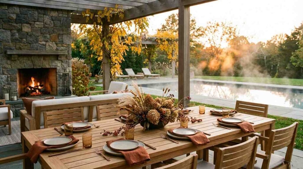 Outdoor staging for the Hamptons market should lean into the season — linen cushions on teak furniture, a folded blanket on a chaise for October showings, a citrus tree in a large terracotta pot near the entrance to the outdoor dining area. The goal is to make a buyer feel the Saturday afternoon they could be having here.
