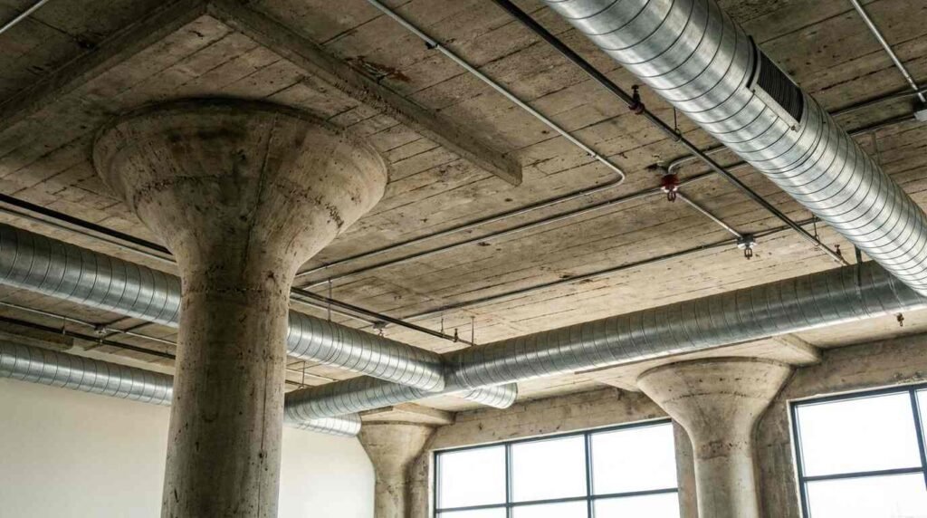 The typical Long Island strip center built between 1955 and 1985 rests on a flat-plate concrete slab — a structural system in which the floor plate is supported directly by columns without intermediate beams, allowing maximum flexibility in partition placement and maximum clear height throughout the floor plan. The column grids in these buildings are generous by residential standards: spans of twenty-five to thirty feet were common, because the retail program required open selling floor unobstructed by structure. The roof structure follows the same logic — long spans, minimal interior columns, flat profile that is cheap to re-clad and cheap to penetrate for new mechanical systems.
