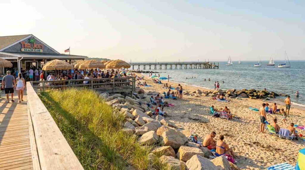 Cedar Beach is the largest North Shore beach in the Town of Brookhaven. It includes two swimming areas (Cedar Beach Main and Cedar Beach West), a fishing pier, a town marina with boat launch ramps, basketball courts, the Marine Environmental Stewardship Center with touch tanks and aquariums, and Tiki Joe’s Beach Club — a seasonal restaurant and live-music venue right on the sand. There is a 700-foot boardwalk through the dunes and a nature preserve connecting the beach sections.