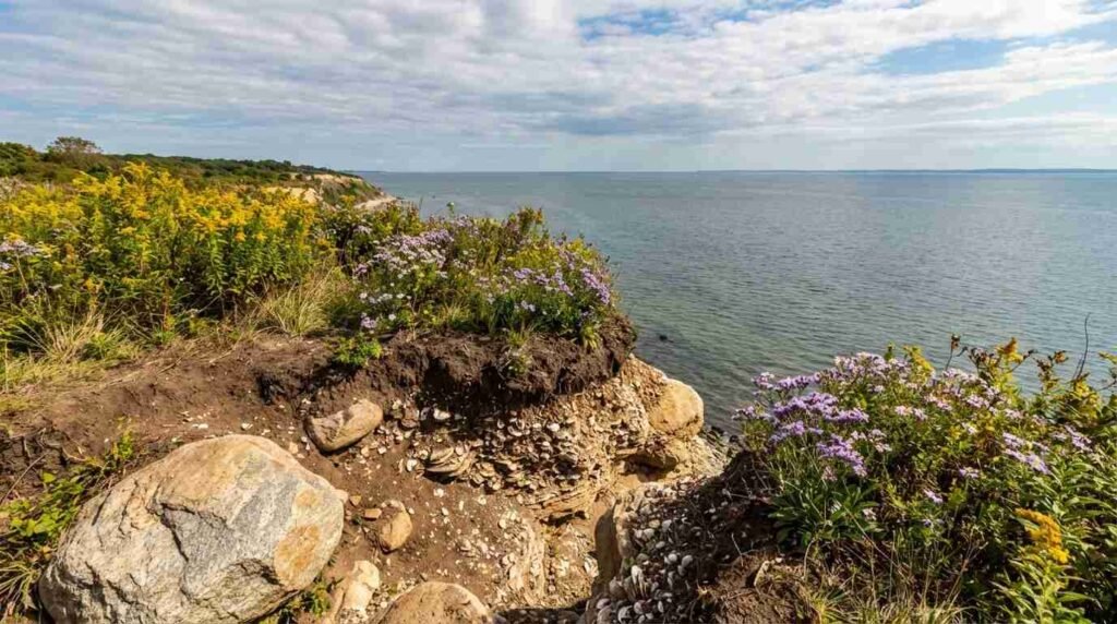 The David Weld Sanctuary is 125 acres of Nature Conservancy land along the Sound — donated in stages by David and Mary Weld between 1969 and his death in 1972, then expanded by neighbors who contributed adjacent parcels. The sanctuary features a 50-foot bluff above the Sound, a 60-foot glacial kettle hole, approximately 1,800 feet of beachfront, and a trail system that passes through tulip trees, red maples, and woodland dense enough to feel genuinely wild despite being ten minutes from Route 25A. Bank swallows nest in the bluff face in summer. Ospreys work the harbor edges. The parking lot holds six vehicles, which is not an accident.