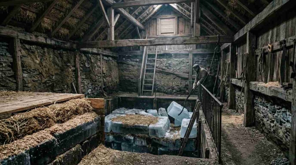 Icehouses at this scale were not passive storage structures. They were active elements of an estate-wide cold chain — a pre-mechanical refrigeration system that required year-round management. In winter, ice was harvested from the estate’s pond and packed into the insulated icehouse structure with layered straw or sawdust insulation. Through the spring, summer, and fall, that stored ice supply was drawn down to cool the house’s larders, produce box, and wine cellar. The labor of maintaining this system — the harvest, the packing, the periodic replenishment from commercial ice suppliers as the estate’s own supply diminished — was continuous and largely invisible to the house’s occupants.