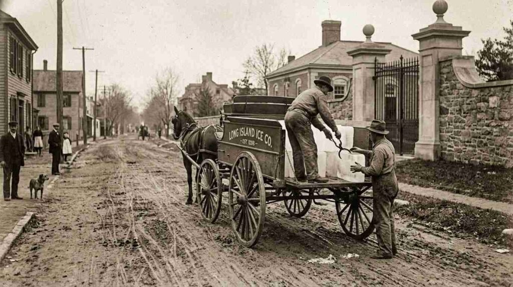 There were, in the first decade of the twentieth century, at least three significant ice storage depots operating in the Oyster Bay township area, servicing the estate trade. Ice was not a luxury — before mechanical refrigeration reached domestic use, large-scale ice delivery was essential to any kitchen operating at estate scale. The ice came from northern ponds in winter, was stored in sawdust-insulated sheds, and was delivered by wagon through the summer months.