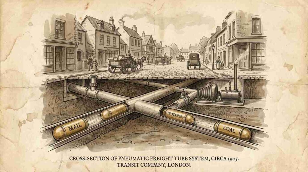 In the winter of 1909, according to minutes of the Nassau County Board of Supervisors held at the Nassau County Museum, a county engineer presented a preliminary study for a pneumatic freight conveyance system. The concept was not new — pneumatic tube networks had been successfully operating in several American cities since the 1870s, most famously in New York City, where the pneumatic mail system ran beneath Manhattan for decades. The Long Island proposal was more modest in scope but more ambitious in its specific application: a network of tubes, installed below grade, that would move freight — groceries, dry goods, coal deliveries, ice, post — from the Oyster Bay station depot to a series of estate service entrances along the ridge roads north of the village.