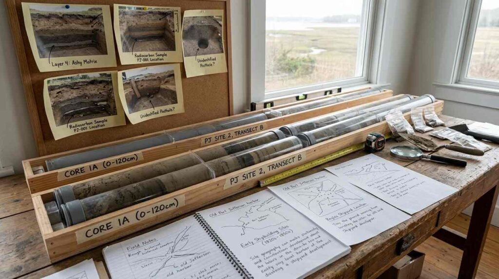 The Three Village Historical Society archives document the specific geography of the shipbuilding operations — the yard locations, the launch ramps, the timber storage areas along the harbor edge — in enough detail to map those activities against the sediment core data. When you do that alignment, the stratigraphy stops being abstract. The iron-rich layer in a core from the north basin corresponds to the location of the iron works. The tar-heavy zone corresponds to the documented caulking yard. The harbor bottom is a spatial record of an industry that operated at the surface and deposited its evidence in the ground below.