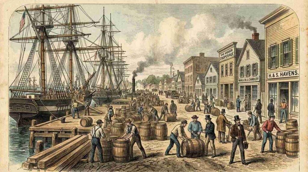 The Sag Harbor Whaling & Historical Museum’s archives preserve a record of the port’s peak years that is worth understanding in physical terms. At its height in the 1840s, Sag Harbor was the fourth-largest whaling port in America. The ships that operated out of Sag Harbor were primarily square-rigged vessels requiring substantial shore-side support: rope walk operations, barrel cooperages (a single long voyage could consume thousands of barrels), sail lofts, blacksmith shops for the ironware, provisioning operations of significant scale.