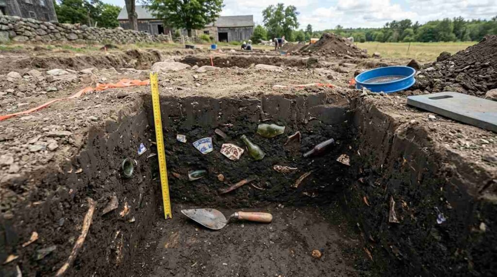 Privy pits are a particularly informative deposit type. A privy pit — the cesspit associated with an 18th or 19th-century outdoor toilet — accumulates an extraordinary variety of material in anaerobic conditions that preserve organic as well as inorganic remains. Food remains, clothing fragments, personal objects that slipped through the seat, the ceramic and glass vessels that were disposed of when they broke — a privy pit is an accidental time capsule of domestic life. The privy pits documented in the Stony Brook University Section 106 surveys represent, in each case, a concentrated deposit of 18th or 19th-century farmstead life preserved in conditions that the subsequent construction activity, in capping them with fill and impervious surface, has actually maintained.