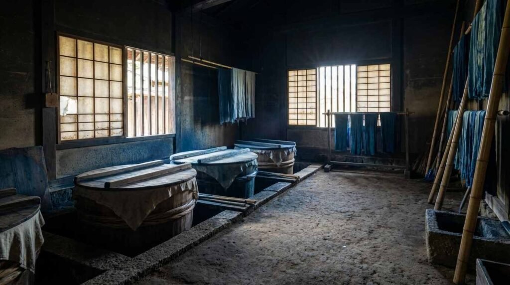 The vat room at a working awa-ai workshop is not a dramatic space. Low ceiling. Wooden vats, each one capped with a cloth, set into the earthen floor or on raised platforms. The temperature in the room is controlled — not mechanically, but by the placement of the vats relative to the building’s orientation and by charcoal braziers in winter. The smell is fermentation: deep, green-brown, like the underside of an old forest.