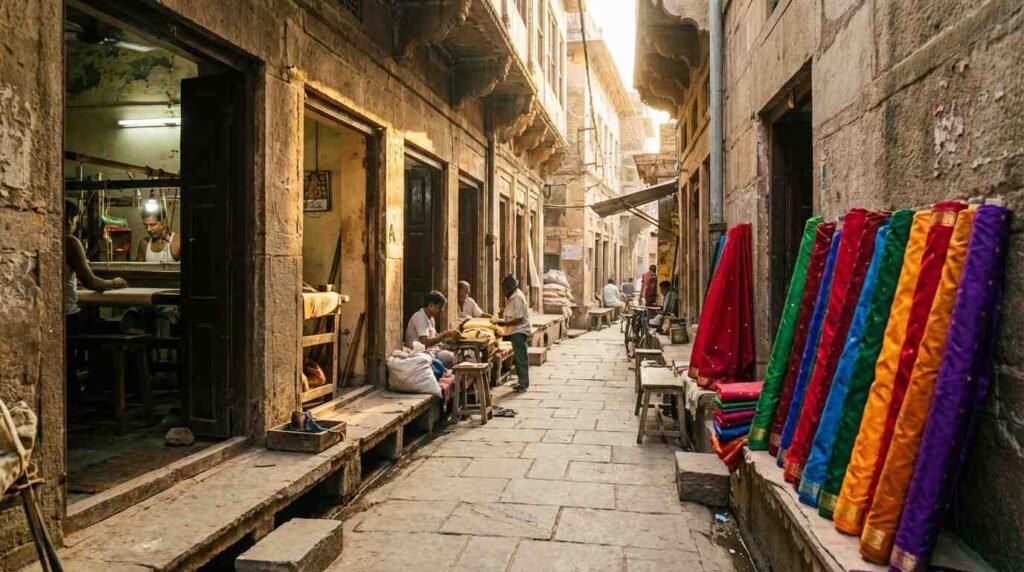 The pit looms of Varanasi sit below ground level — the weaver descends into a shallow trench to work the foot pedals — and the rhythm they produce is the ambient sound of the Peeli Kothi neighborhood. These are not museum objects. They are in active use in homes and attached workshops, producing fabric under a Geographical Indication tag registered under Indian law in 2009 (GI application No. 14), which legally defines what Banarasi fabric is and where it must be made.