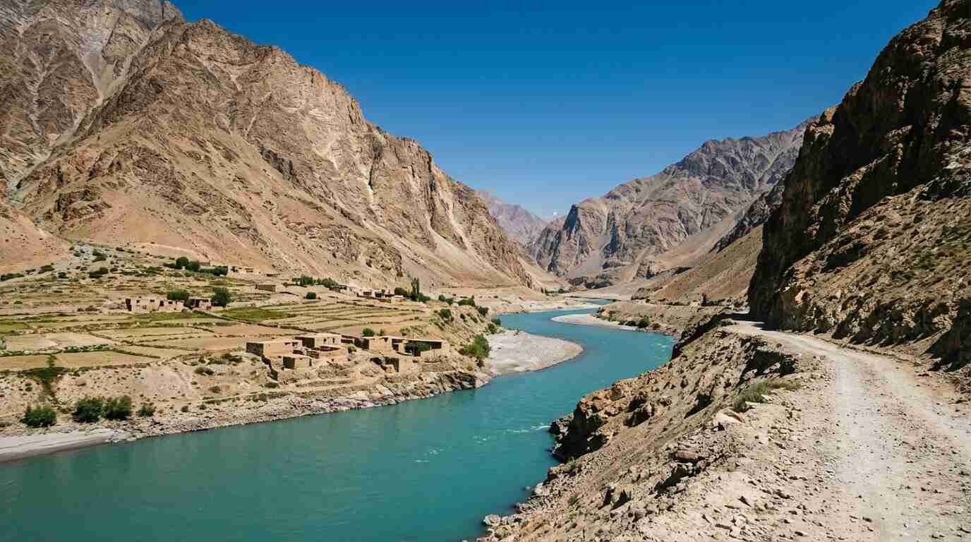 The Panj River forms the border between Tajikistan and Afghanistan along the Wakhan corridor. The road on the Tajik side follows the river for several hundred kilometers. On the far bank, Afghanistan.